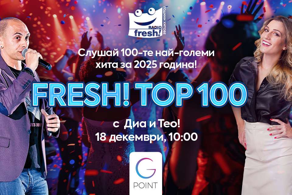 Всичко това и още повече ще чуете във FRESH TOP 100 - селекцията на 100-те най-горещи песни от ефира на Радио Fresh! На живо на 18 декември, между 10 и 18 часа, с водещи DIA и Тео, с повторения на: 26 декември от 12ч., в празничния 31 декември от 18ч. и на 2 януари, от 12ч.